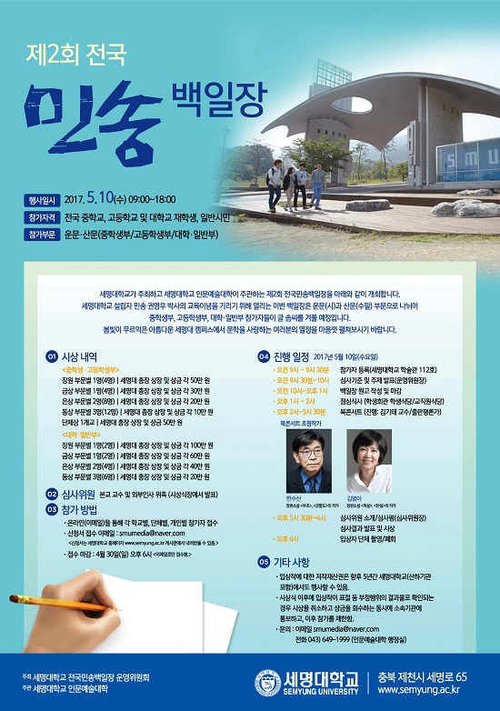 행사는 5월 10일(수) 충북 제천 세명대학교에서 열린다. 참가자격은 전국 중·고등학생 및 대학교 재학생과 일반 시민이면 누구나 참가 가능하다. 참가부문은 운문과 산문으로 시상은 ▲중학생 ▲고등학생 ▲대학생·일반 시민으로 나뉘며, 부문별로 장원·금상·은상·동상으로 이뤄진다. 입상자에게는 상장과 상금이 수여된다. 참가방법은 세명대 홈페이지(www.semyung.ac.kr)에서 신청서를 내려받은 뒤, 온라인(이메일) smumedia@naver.com로 학교별·단체별·개인별로 접수하면 된다. 신청서 접수 기간은 4월 30일(일) 오후 6시 까지다.