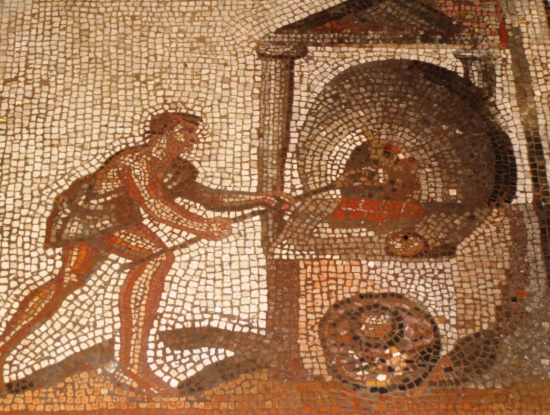 로마의 방앗간은 밀가루만 빻았는가? 폼페이 유적으로 다시 발길을 돌려 보자. 방아 옆으로 붉은색 벽돌 구조물이 보인다. 아래는 불을 때는 아궁이, 반원형의 윗부분은 밀가루 반죽을 넣어 굽는 선반, 그러니까 화덕이다. 이 붉은 구조물이 화덕이고 여기서 빵을 구웠는지 어떻게 알 수 있을까? 로마인들은 후대의 호기심 많은 한국 사람들을 위해 친절하게 여러 종류의 유물을 남겨 놓았다. 이번에는 조각이 아닌 모자이크를 보자. 장소를 프랑스로 옮긴다. 프랑스 수도 파리에서 교외선 전철을 타고 서쪽으로 가면 아담한 전원도시 생제르맹앙레에 닿는다. 전철역 앞의 고풍스러운 건물 박물관에 3세기 로마 시대에 만들어진 주옥같은 농촌 풍속 모자이크가 기다린다. 화덕에 기다란 장대를 부지런히 넣었다 빼며 빵을 굽고 있는 인부의 모습이 살아 움직인다. 이 장면은 어딘지 모르게 익숙하다. 대한민국 서울 한복판의 화덕 피자집에서 익히 보는 모습이다. 폼페이 근처 대도시 나폴리의 뒷골목으로 가면 역시 이런 풍경으로 지금도 부지런히 피자를 구워 판다.