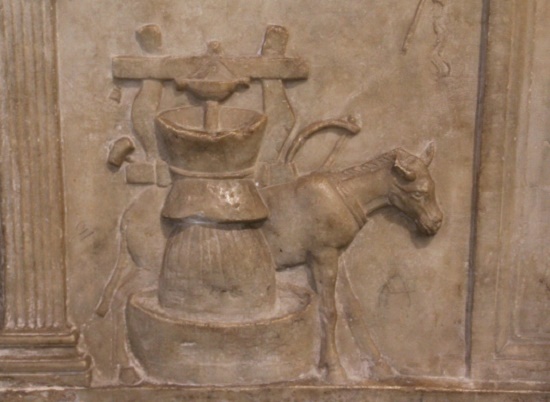 현장에서 보는 돌 유물은 두 종류다. 먼저 원추형 돌은 숫방아다. 두 번째는 여기에 속이 빈 장구 형태의 암방아를 덮어씌운 거다. 암방아와 숫방아 사이로 밀을 넣고, 암방아를 돌리면 밀이 두 방아 사이에서 으깨지며 밀가루로 곱게 갈린다. 우리네 맷돌은 위아래로 돌을 놓고 손잡이로 돌렸다. 집마다 놓고 썼던 맷돌과 달리 폼페이의 이 방아는 한 장소에 여러 개다. 개인 집은 아니라는 얘기다. 밀 방앗간이다. 그럼 이 큰 돌방아를 누가 돌릴까? 사람이 움직이기에는 너무 무겁다. 당나귀. 로마의 방앗간에서는 암수로 이뤄진 여러 개의 방아가 있고, 이를 당나귀들이 종일 돌렸다. 사람은 옆에서 밀을 넣고, 가루를 빼내는 역할을 맡았다. 당나귀가 방아를 돌리는 장면을 보려면 이탈리아 수도 로마의 또 다른 나라, 바티칸 시티로 가야 한다. 바티칸 교황청 박물관의 로마 시대 조각에 열심히 방아 돌리는 당나귀의 고달픈 모습이 생생하게 묘사돼 있다.
