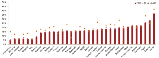 OECD가 성별 임금격차 조사를 시작한 2000년부터 한국은 15년째 불평등 순위 1위다. 2000년 성별 임금격차 지수인 41.7%에 비해 아주 근소하게 개선되었을 뿐이다.