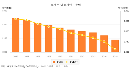 도시와 농촌의 소득 격차가 더 벌어졌다. 통계청 가계동향조사에 따르면 2016년 2인 이상 도시 근로자가구 평균소득은 5,805만 원으로 전년보다 0.43% 증가했다. 농가의 평균소득은 3,719만 원으로 도시 근로자가구 소득의 64%다.