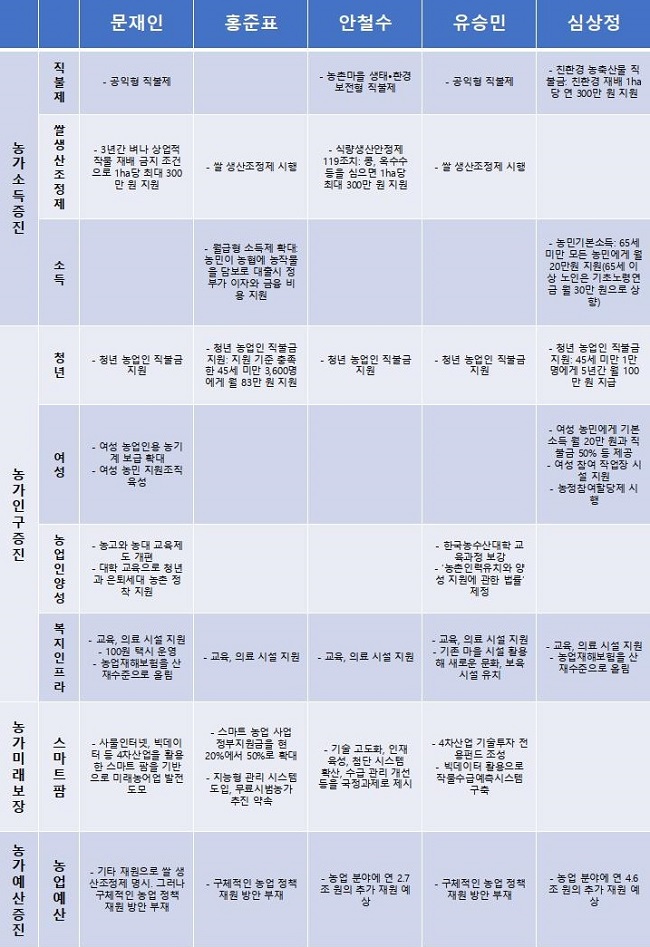 19대 대선 후보들은 농촌 인구유출을 막기 위해 다양한 공약을 선보였다. 그중 청년층 유입은 다섯 후보가 모두 고민한 대목이다. 현행 청년농민 지원정책은 기준을 충족하는 40세 미만 청년에게 2년간 월 80만 원 수준을 지급하는 것을 뼈대로 하나 효과는 미미하다. 2016년에는 불과 248명이 선정됐을 정도다. 이를 해결하고자 후보들은 농업에 종사하는 청년의 수입을 보조해주는 ‘청년 농업인 직불금’을 공통으로 제시했다.