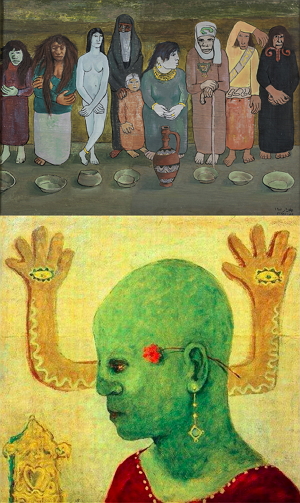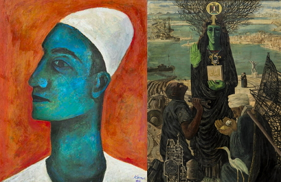 케말 유시프의 <귀족>과 압둘하디 알자제르의 <헌장> 속 등장하는 지배계층은 초록색이다. 이집트인들에게 초록색은 신(神)의 색을 의미했다. 고대 이집트에서 풍요와 저승의 신으로 숭배된 오시리스를 초록색으로 그렸던 관습이 굳어져서다. 그러나 근대 이집트 미술 작품에서 초록색으로 상징되는 상류계급은 부정적이다. 유시프는 음울하고 깊은 청록색을 사용해 귀족을 그렸다. 알자제르가 그린 초록빛 신도, 초록빛 신을 우러러보고 제물을 바치는 사람들의 모습도 음울한 모습이기는 마찬가지다. 표정과 구도도 그렇지만 특히 음울한 청록색조는 당대 이집트의 비참한 현실을 드러내고 있다. 영국 지배세력과 결탁해 민중을 수탈한 이집트 지배세력에 대한 불신과 절망이 작품 속에 반영돼 있는 것이다.