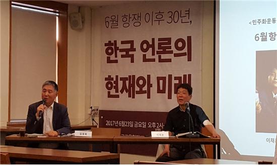<미디어오늘>과 민주화운동기념사업회가 23일 오후 서울 프란치스코교육회관에서 ‘6월 항쟁 이후 30년, 한국 언론의 현재와 미래’라는 주제로 기획토론회를 열었다. 한국 언론의 지난 30년을 돌아보고 언론자유투쟁의 현실진단과 과제, 전망 등을 이야기했다. 발제자로는 이채훈 PD연합회 정책국장, 이정환 미디어오늘 대표, 이봉수 세명대 저널리즘스쿨대학원장, 김성해 대구대 교수가 참여했다.