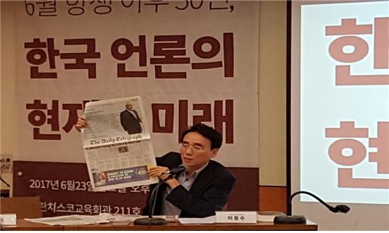 세 번째 발제자인 이봉수 세명대 저널리즘스쿨대학원장은 ‘진보 언론의 과제와 전망’을 발표했다. 이 원장은 영국 <가디언>, 프랑스 <르몽드>, 스페인 <엘파이스>를 예로 들며 왜 유럽에서 진보언론이 비주류가 아니라 주류매체가 되었는지 설명했다.