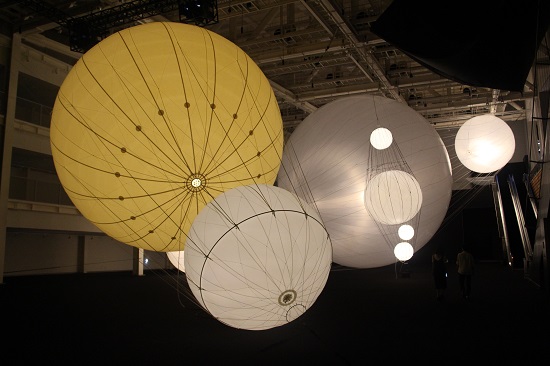 토마스 사라세노의 작품을 제대로 만나기 위해서는 1층 출입구로 들어가지 않고 계단을 통해 2층으로 올라가야 한다. 작품 전체를 위에서 조망하며 관람을 시작하길 바란 작가의 의도다. 2층 출입구에 두 겹으로 쳐진 검은 장막을 손으로 걷고 들어서자 커다랗고 하얗게 빛나는 구(sphere)가 전시장을 가득 채우고 있다. 에스컬레이터를 타고 전시장으로 내려가면 거대한 구에 가려졌던 다른 구들이 하나씩 모습을 드러낸다. 노랑, 잿빛, 흰색 등 다양한 색의 구들은 크기와 재료가 다르고 빛의 밝기도 다르다. 구들은 색과 모양이 다른 행성들이 모여 있는 우주의 모습을 닮았다. 검은 배경에 설치된 형형색색의 구들이 설치된 전시장으로 천천히 내려가는 동안에 관람객은 자신이 우주 안으로 빨려들어 가는 느낌을 받는다. 건축가이자 예술가인 토마스 사라세노의 국내 최초 개인전 <행성 그 사이의 우리>는 관객을 전시의 일부로 끌어들이며 색다른 체험을 안겨준다.