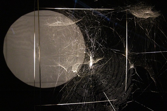 전시는 달과 9개의 구 사이에서 집을 짓고 있는 네필라 거미(Nephila spider)가 만들어내는 소리도 만들어 낸다. 거미는 행성과 같은 거대한 구나 인간에 비하면 지극히 하찮은 존재다. 사라세노는 그런 거미가 주인공처럼 눈부신 빛을 받으며 우리 눈에는 거의 보이지 않을 만큼의 섬세한 움직임으로 집을 짓게 설치했다. 거미가 움직이며 집을 짓는 동안 거미줄이 튕기며 작은 소리가 난다. 너무 저주파라 들을 수 없는 이 소리는 거미줄 아래에 설치된 고감도 마이크에 의해 증폭된다. 먼지 입자와 거미가 만들어내는 두 소리는 서로 포개지며 조화를 이루고, 합쳐진 소리가 다시 공간 안의 먼지 입자를 진동하고 흩날리게 한다. 전시공간은 우주 소리와 거미와 먼지, 인간이 만들어낸 즉흥연주로 채워진다. 생물과 무생물이 함께 만들어낸 소리는 우주 소리와 어울려 화음이 되고, 우주의 일부가 된 관객과 그를 둘러싼 생태계는 더불어 하나가 된다.