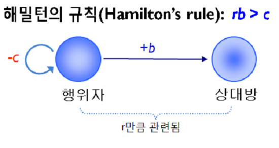 이 공식은 진화를 유전자의 눈 관점(Gene’s eye view)으로 본다는 측면에서 중요한 의미를 가진다. 지금은 <이기적 유전자>의 흥행으로 널리 알려졌지만 해밀턴의 규칙이 진화를 유전자의 관점에서 설명하는 이론의 기초를 제공한 것이다. 해밀턴은 한발 더 나아가 혈연선택설(Kin selection)을 주장한다. 혈연선택설은 자연 선택에 의한 생물의 진화를 볼 때 개체가 스스로 남긴 자손의 수뿐만 아니라 유전자를 공유하는 혈연자(예를 들면 친척)의 번식 성공에 미치는 영향도 고려해야 한다는 진화생물학 이론이다. 이에 따르면 혈연은 r만큼의 나 자신인 셈이고, 그러므로 아무런 대가도 기대하지 않는 진정한 이타적 행동은 rb > c가 성립할 때의 혈연에 대해서만 가능하다고 해밀턴은 주장한다.