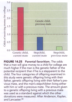 전 교수는 현대 미국 사회에서 아버지가 의붓자식보다 친자식의 대학등록금을 감당하는 빈도가 훨씬 더 높다는 자료를 제시했다. 이전 부부관계에서 생긴 친자식에 대한 지원을 기준으로 했을 때, 현재 부부관계의 친자식에게는 2.5배 이상을 지원한다. 반면, 이전이든 현재든 의붓자식에게는 그보다 적은 지원을 한다. 즉, 계부모는 유전적 부모가 자연스럽게 느끼는 사랑이나 헌신을 그대로 느끼기 어렵다.