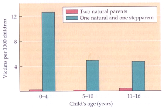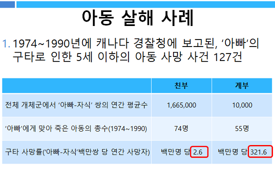 데일리와 윌슨 부부는 캐나다 경찰청에 보고된 아동 사망사건을 연구했다. 1974년부터 1990년 사이에 아빠의 구타에 따른 5세 이하 아동 사망 사건 127건을 검토한 결과, 아이들 100만 명 가운데 친부에게 살해당한 아이는 2.6명이었다. 계부에게 살해당한 아이는 100만 명당 321.6명이었다. 확률이 120배 더 높다. 이 자료에서 친부에게 맞아 죽은 아동의 총수는 74명이고 계부에게 맞아 죽은 아동의 수는 55명이다. 74명이 55명보다 더 많으므로 친부가 계부보다 더 위험하다는 말은 성립하지 않는다. 그 외에 영국, 스웨덴, 미국의 사례에서도 의붓자식이 친자식보다 학대를 당하거나 사망할 확률이 수십 배에서 100여 배 더 높았다.