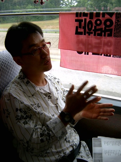 ▲ <희망의 나라로>를 부르는 강진석(직장인ㆍ40) 씨. 왜 버스에 올랐냐는 질문에 "1차 희망버스를 못 타서 아쉬웠다. 크레인에 올라가 계신 김 지도위원이 제발 무사히 내려오셨으면 하는 마음으로 부산으로 간다"며 눈시울을 붉혔다. ⓒ 안세희