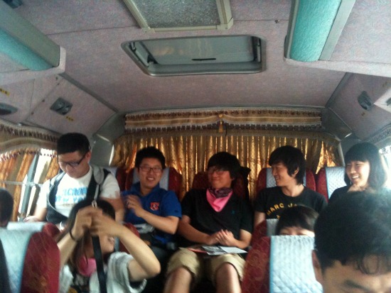 ▲ 다섯 시간이 넘게 걸리는 이동 시간 동안 버스 안에서는 갖가지 행사가 있었다. 구호 카드를 그리며 장식하는 참가자. ⓒ 안세희