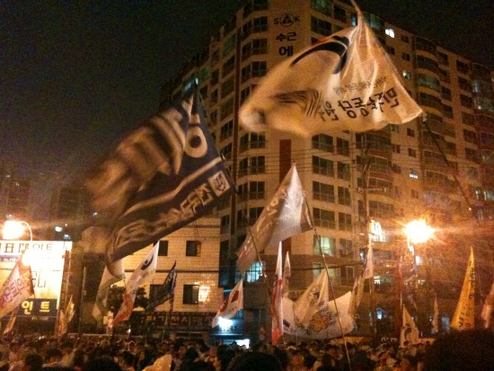 ▲ 수십 개의 휘날리는 깃발. 민주노동당과 전국금속노조의 깃발이 보인다. ⓒ 안세희