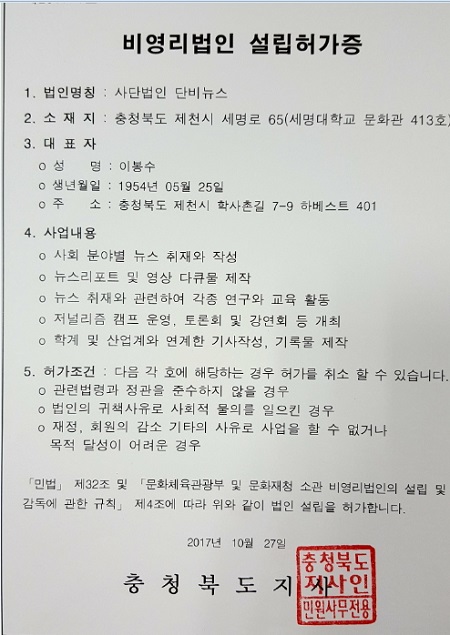 드디어 오늘 충북도청으로부터 '사단법인 단비뉴스' 비영리법인 설립허가증이 나왔습니다. 법인 설립에 이렇게 많은 서류작업과 긴 절차가 필요한 줄 몰랐습니다. 지난 25일에는 도청 담당직원이 스쿨까지 직접 와서 시설·장비 실사를 하고 갔습니다.