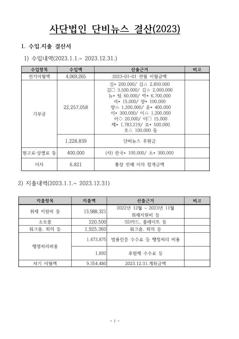 2023 단비뉴스 기부금 포함 결산 보고 작성자: 단비뉴스작성일: 2024-06-10 13:35:41220.90.140.117조회수: 2083 첨부파일 사단법인 단비뉴스 2023 결산.jpg (122257 Byte)
