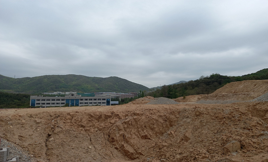 ‘알미부락’이라고 불리는 두학동 5통 일대는 기존 마을 뒤편으로 공사가 한창 진행중이었다. 마을 초입에서부터 산을 깎고 멀쩡한 나무들을 벌목하는 공사가 진행중인 것을 볼 수 있었다. 취재진이 공사 현장으로 가까이 가자 컨테이너로 된 택지 분양 상담실이 있었다. 택지 분양을 홍보하는 현수막도 곳곳에 걸려 있었다.