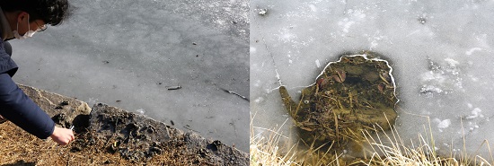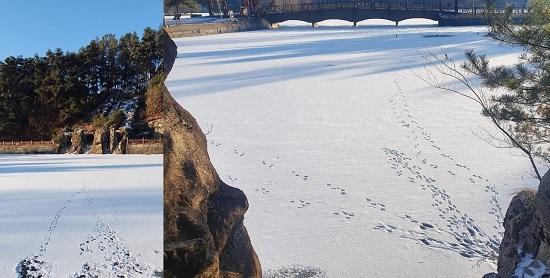 어경연 교수는 겨울이 된 뒤 수달 관찰을 본격적으로 시작했다. 눈이 쌓이면 발자국을 추적하기 위해서다. 어경연 교수와 함께 의림지로 나가봤다. 빙판 위에 남은 수달 발자국이 의림지 서편에 조성된 인공절벽으로 이어져 있었다. 뒤가 좁고 앞은 부채처럼 넓은 모양, 앞발과 뒷발 간격이 넓은 형태, 선명하게 찍힌 다섯 발가락이 분명한 수달 발자국이었다. 어지럽게 뒤섞인 고양이나 고라니 발자국과는 확연히 구분됐다.