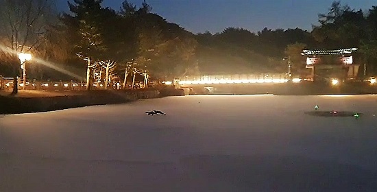 물고기를 마저 넘기자마자 다시 얼음구멍에 뛰어든다. 정확히 1분 만에 더 큰 고기를 물고 올라온다. 어른 손바닥만 한 먹이를 잠수에 걸린 시간보다도 빨리 해치운다. 야생 수달이 왕성하게 식사하는 진귀한 모습을 바라보는 사람, 야행성인 수달을 살피러 밤마다 의림지를 지키는 세명대 어경연 교수다.