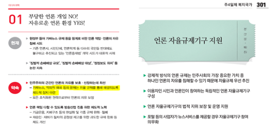 윤석열 후보도 공약집을 통해 “가짜뉴스, 악의적 왜곡 등의 문제는 자율규제를 통해 해결되도록 제도적 장치 마련”하겠다고 밝혔다. 다만 지난달 12일 유세에서 윤 후보는 개인 인권을 침해하는 허위 보도를 할 경우 “언론사 전체를 파산하게 하는 강력한 시스템이 필요하다”고 자율규제와 배치되는 발언을 했다.