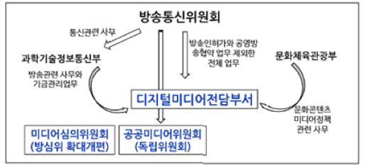 미디어 정책 전담 부처 신설 공약은 이재명, 윤석열, 심상정 등 여러 후보가 공통적으로 내놓았다. 현재 부처별로 흩어진 미디어 정책 기능을 합쳐서 하나의 미디어 진흥을 위한 부처와 규제를 담당하는 독립 위원회로 개편하는 방안이다. 현재 과학기술정보통신부, 문화체육관광부, 방송통신위원회 3개 부처로 미디어 정책 기능이 분산되어 효율성이 떨어진다는 지적이 있다. 최근에는 유튜브나 넷플릭스 같은 글로벌 플랫폼 사업자가 국내 콘텐츠 시장에서 조세나 규제의 특혜를 받고 국내 콘텐츠 기업이 역차별을 받는다는 문제 제기가 나오기도 했다. 따라서 이들 신규 미디어까지 포괄해서 진흥과 규제를 하는 미디어 통합기구가 필요하다는 것이다.
