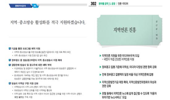자치분권이 강조되는 만큼 지방 권력을 감시하는 지역언론을 지원하는 공약도 제시됐다. 주로 지역언론사 경영난 해소를 위한 방안이 많다. 지역 언론에 대한 정부광고나 기존에 지원해왔던 방송통신발전기금, 지역신문발전기금을 늘려주겠다는 내용이다. 이재명 후보는 공약집을 통해 “지역 중소방송 활성화를 적극 지원”하겠다고 밝혔다. 구체적인 내용으로는 자체 제작비율이 높은 지역방송사에 방송발전기금을 더 지원하는 인센티브 제도를 제시했다. 이 후보는 지역방송만을 위한 ‘지역방송발전기금’도 마련하겠다고 했다.