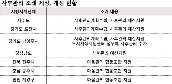 제주도에 이어 다른 지자체들도 도시재생사업의 사후관리를 위한 조례를 제정하거나 개정했다. 경기도 포천시는 지난 2월 ‘포천시 도시재생사업 사후관리 조례’를 제정했다. 남양주시도 지난달 ‘남양주시 지속가능한 도시재생사업 사후 지원·관리 조례’를 제정하고 사후 지원과 관리에 관한 사항을 도시재생지원센터의 업무에 추가했다. 2021년 11월 경상남도는 기존 도시재생 조례를 개정해 사후관리를 지원할 수 있는 조항을 추가했다. 전북 전주시와 충남 공주시, 인천 계양구는 마을관리 협동조합 설립과 자생력 확보를 위한 지원을 기존 도시재생 조례에 포함시켰다.