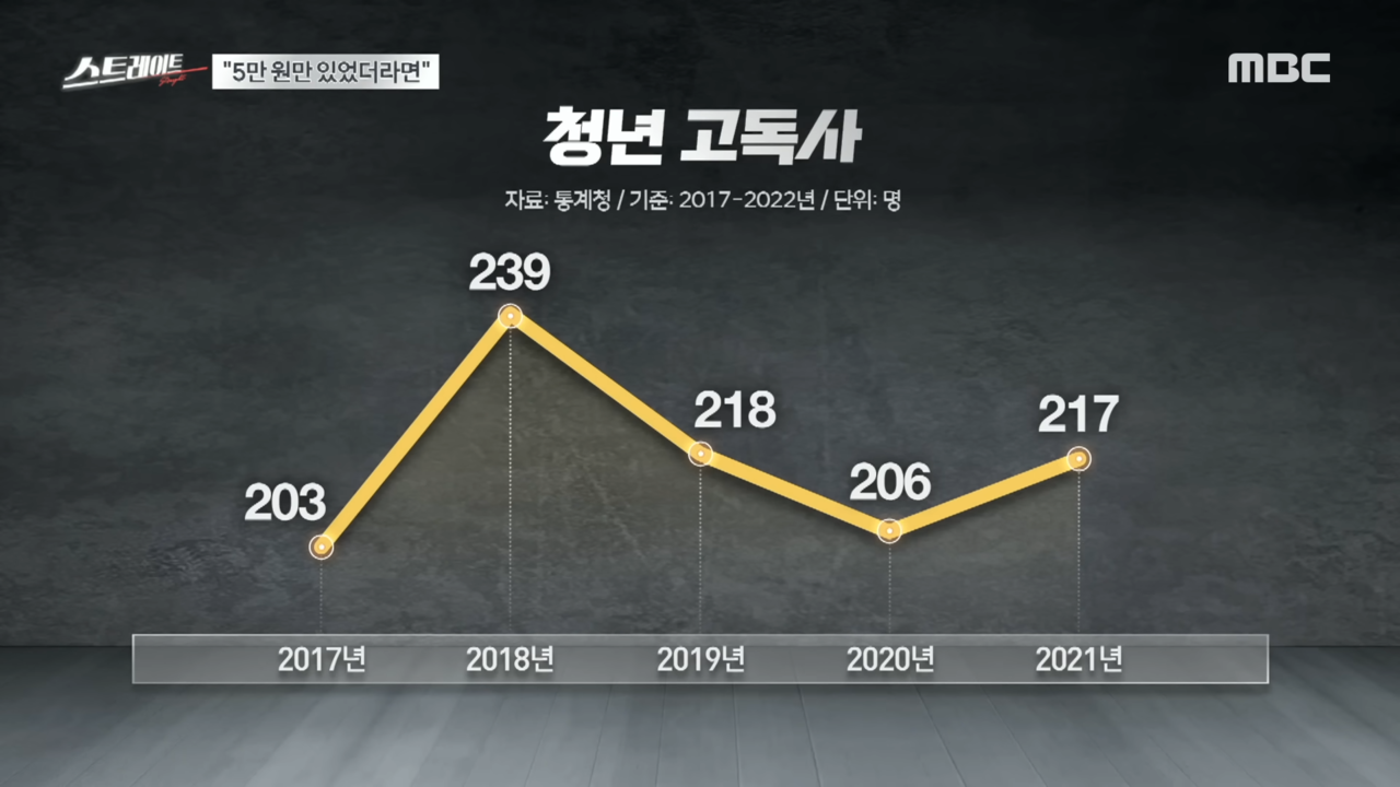 경제적 불평등이 심화하는 가운데 취업난까지 겹쳐 저소득층 청년에게는 이중의 고통이 되고 있다. 생계의 무게에 짓눌린 청년들이 외부와 단절되면서 결국 죽음에까지 이르는 것이 바로 청년 고독사다. 지난 4월 MBC ‘스트레이트’에서 방영한 <2023 청년보고서 ‘희망금지’> 편은 청년 고독사 문제를 담았다. 지난해 통계청에서 발표한 고독사 실태조사에 따르면 최근 5년간 매년 200명가량의 청년이 고독사로 죽었다.