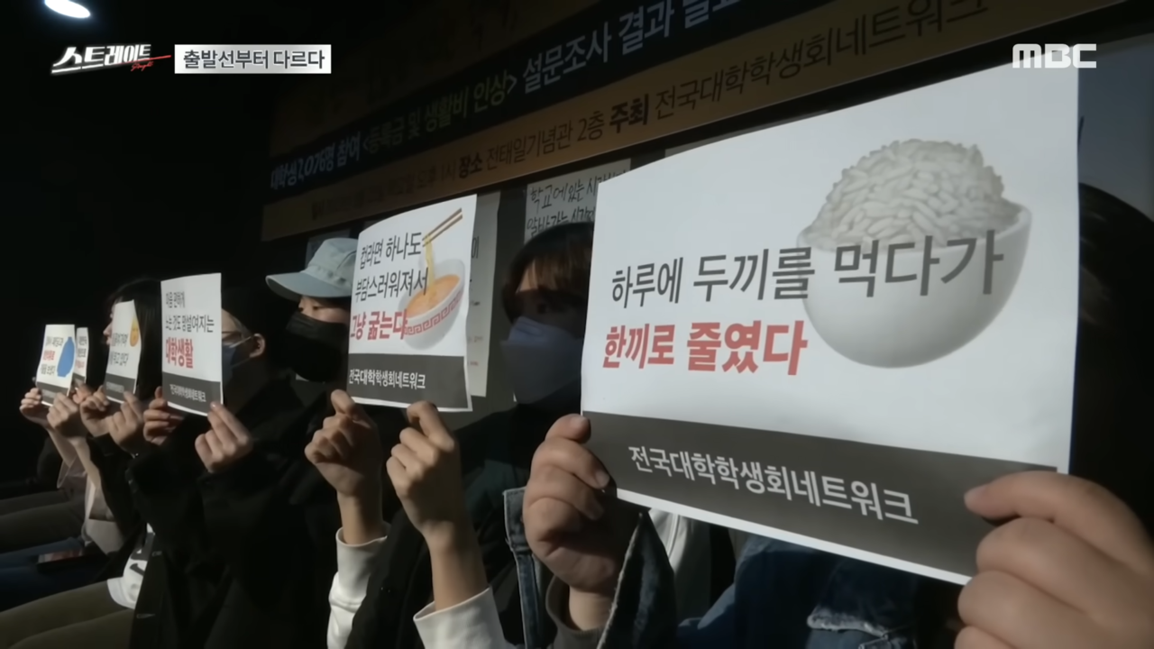 방송은 지난 3월 23일 전국대학학생회네트워트 주최로 열린 ‘대학생 생활고 증언 기자회견’의 모습을 담았다. 이 자리에 모인 대학생들은 ‘하루에 두 끼를 먹다가 한 끼로 줄였다’, ‘컵라면 하나도 부담스러워져서 그냥 굶는다’ 등의 구호를 외쳤다. 소득이 낮을수록 많은 일에서 기회가 제한된다고 토로했다. 대학생 박서림 씨는 금전적으로 여유롭지 못한 상황이 “사람들을 만나는 일을, 그리고 다양한 경험들을 하는 일을 더 각박하게 느끼게 만든다”고 말했다.