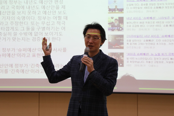 지난 4일 충북 제천시 세명대 학술관에서 이상민 나라살림연구소 수석연구위원이 이렇게 말하며 강연을 시작했다. 세명대 저널리즘대학원의 인문사회교양특강에 초청된 그는 ‘세금과 나라 살림의 이해’를 주제로 한 강의에서 조세·재정과 관련한 언론 보도의 문제점을 집중적으로 지적했다. 참여연대 조세재정개혁센터 실행위원으로도 활동하는 그는 2022년 ‘경제뉴스가 그렇게 어렵습니까’라는 책을 펴내기도 했다. 이 위원은 <한겨레> <미디어오늘> <시사인> 등에 칼럼을 연재하고 있으며, 여러 방송 프로그램에서 경제 관련 해설을 해 왔다.