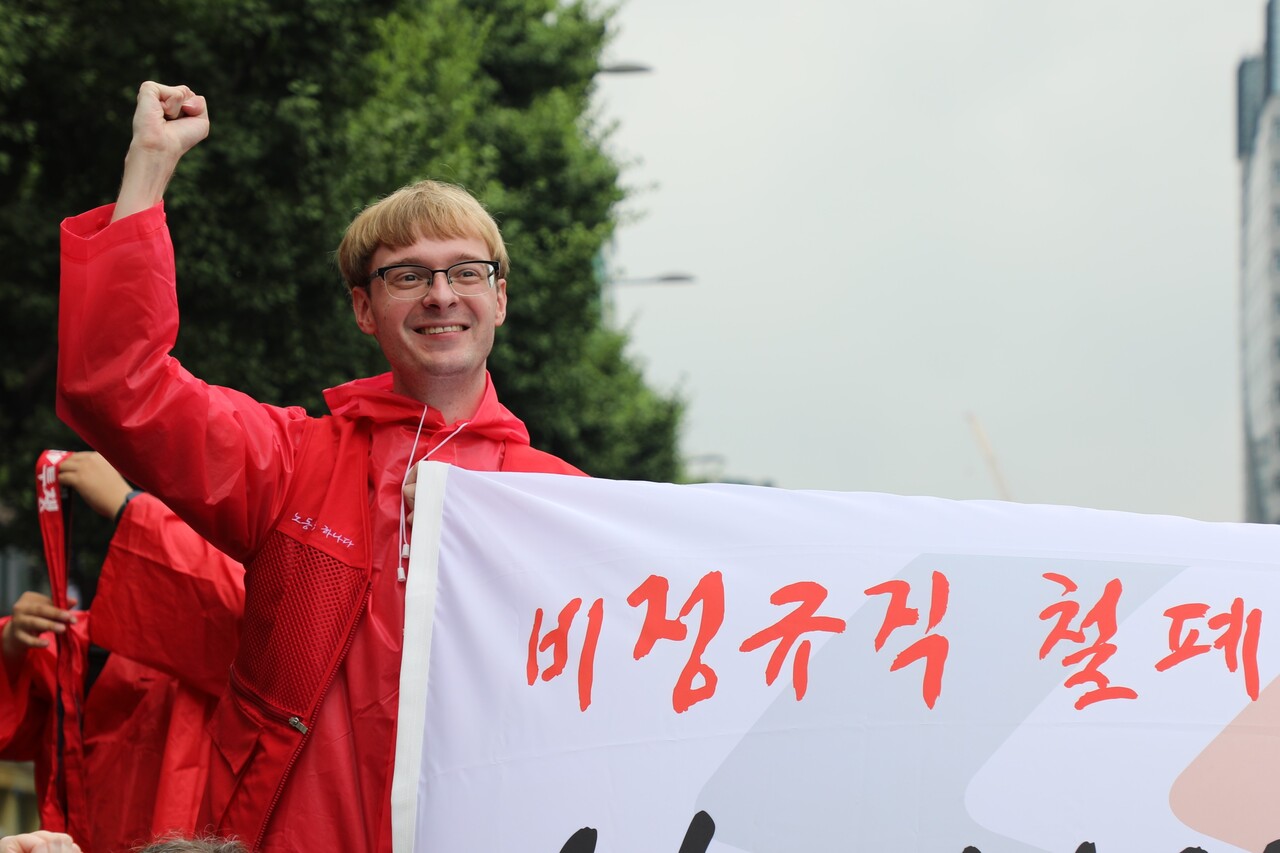 누군가 한국어로 구호를 외쳤다. 미국에서 온 오스틴 배쇼어(27) 씨였다. 이날 오스틴은 깃발을 들고 원어민 강사들의 앞자리를 지켰다. 평소 그는 학원에서 초등학생들에게 영어를 가르친다. 이주노동자들에게 한국의 법과 문화를 소개하는 틱톡 계정도 운영하고 있다. 그리고, 필요할 때마다 오스틴은 노란 리본을 단 빨간색 조끼를 여미고 한국의 노조원으로 살아간다. 그는 원어민 강사노조의 충청분회장이다.